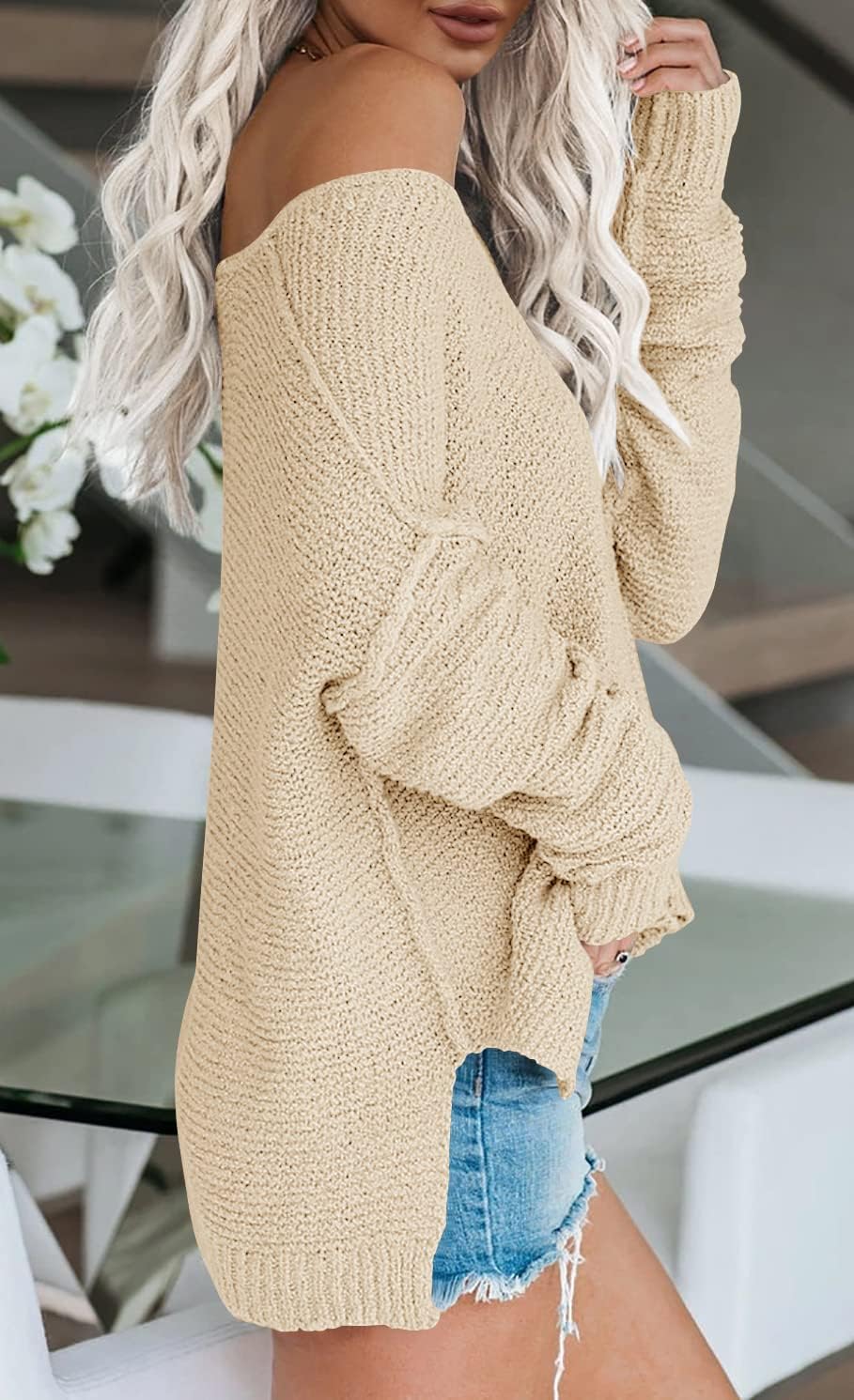 - ✿Features: Oversized Sweaters for Women, Classic Rounded V-Neckline, Long Sleeve, One Shoulder, Dropped Shoulder, Side Slits, Solid Color